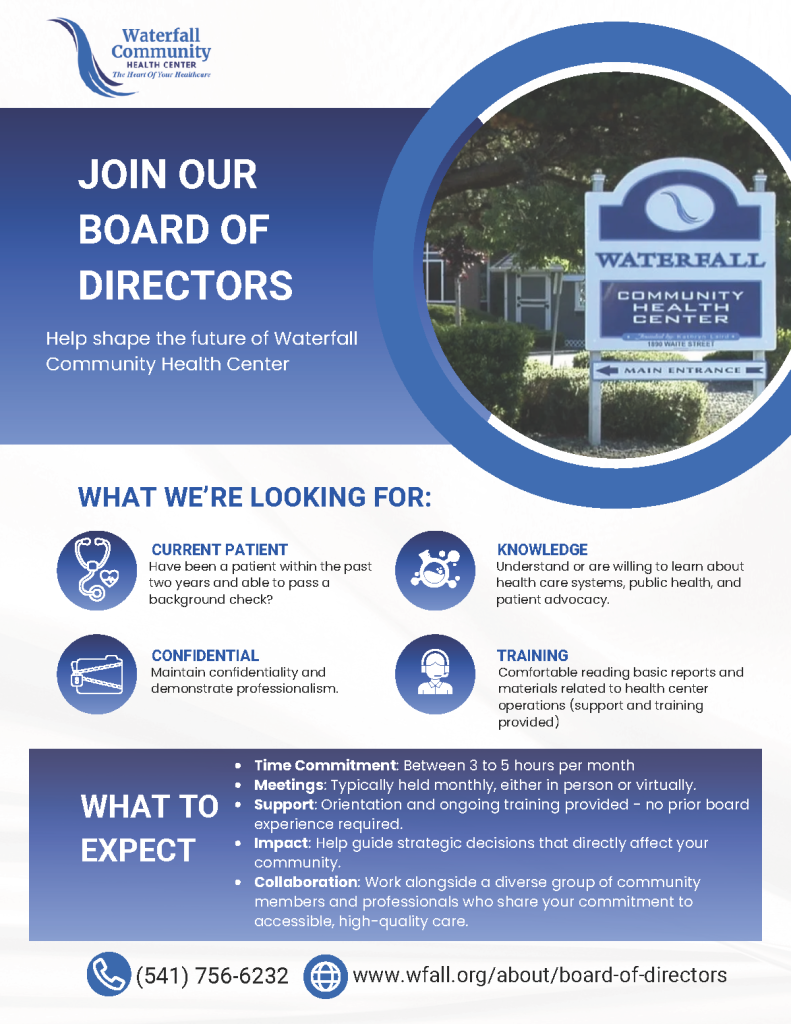 The Board of Directors meet regularly to ensure that the center is community based and responsive to the community’s health care needs. Over 51% of the board members are active, registered clients of the health center who are representative of the population served by the Waterfall.